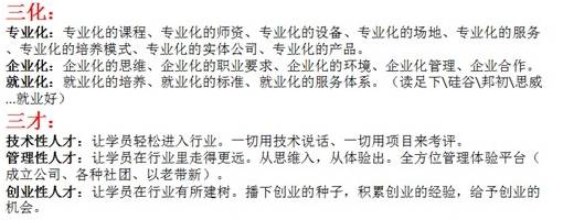 足下是做职业教育的,一直是技能和素质教育两手抓。很多高中生经过足下2年的培养直接外派到北京等大企业工作(说明:企业对外派人员的要求很高,至少具有2年以上的大型软件项目开发经验)。为了满足企业对人才的需求,足下的教材每18个月要更新一次,在2014年1月24日,正式发布足下最新教育产品OEAC8.0。