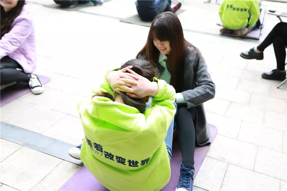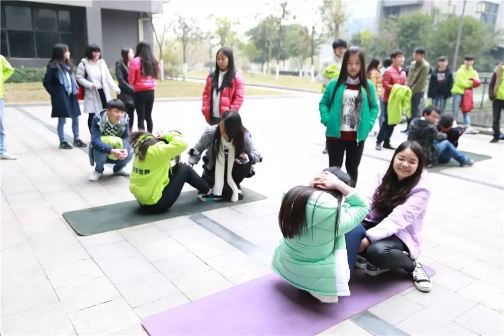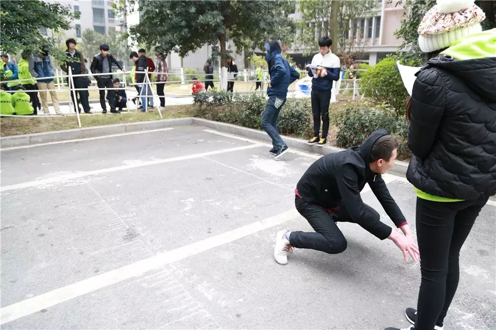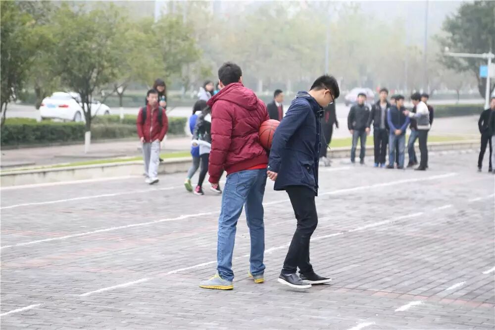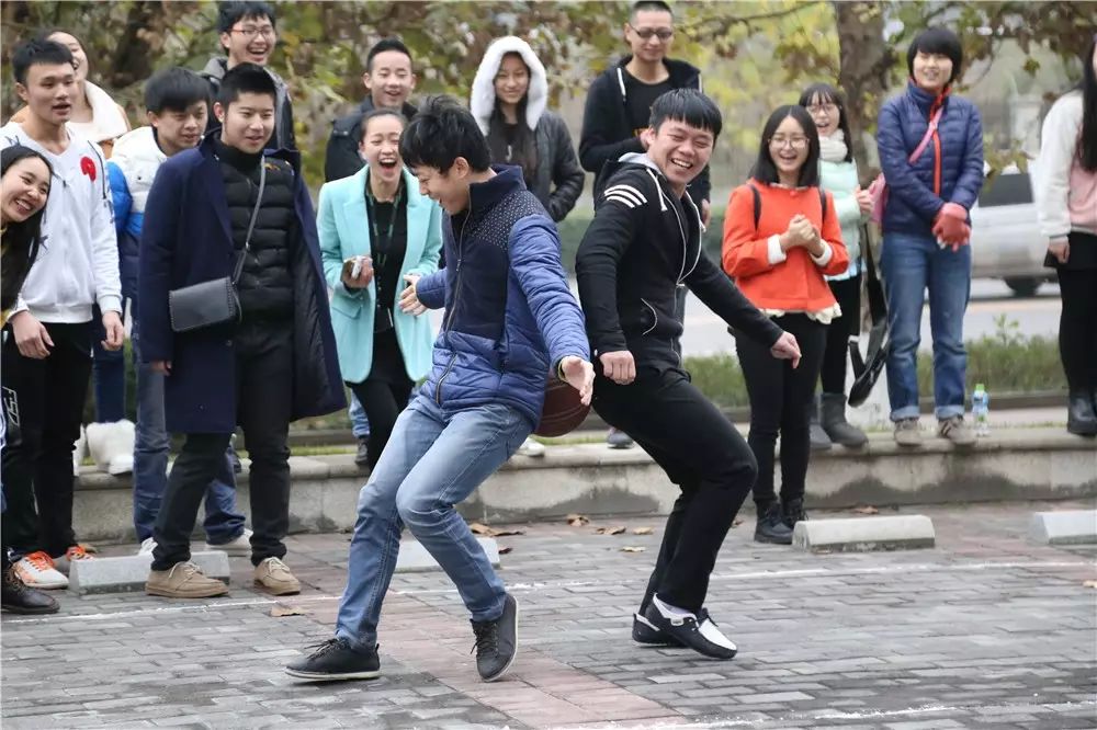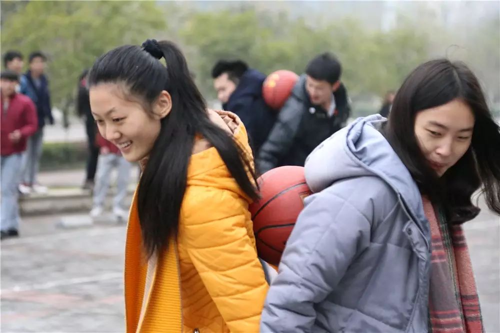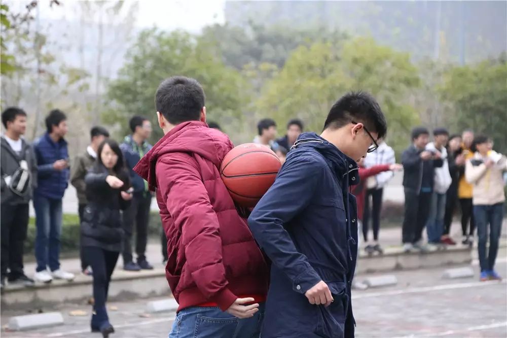 我们看到,大家在进行这个“背运篮球”的时候发生了许多的状况,有的是前面那个人走快了,后面那个人就一屁股坐在了地上;有的是两人走着走着篮球就滑了下来;甚至有的是在起点的时候篮球还在背上,终点的时候篮球就在屁股上了。