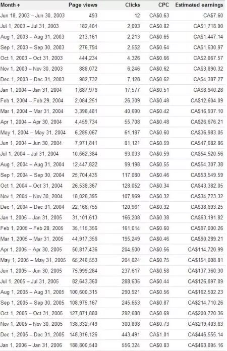 2003年6月,只有493个浏览量,广告收入7.6加拿大元(差不多跟美元等值);2013年7月,就有了18万多的浏览量,广告收入1千7百多了。慢慢每月稳步递增,到了2004年2月,广告收入已经到了1万2千多了。2004年6月的收入,突破了5万块钱。2005年4月,月收入突破10万元。